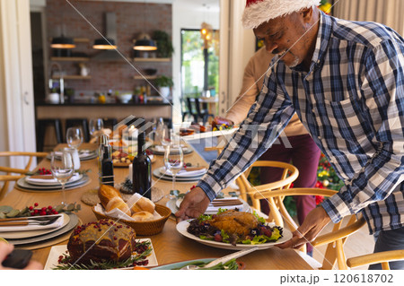 African American senior man in Santa hat serves Christmas dinner in sunny room