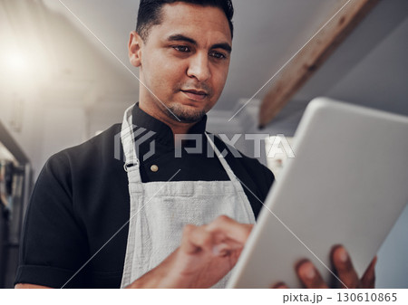 Man with apron, focus and tablet for online recipe, cooking instructions and connection in kitchen. Male, chef and gentleman with device, communication and search for ingredients, thinking and ideas