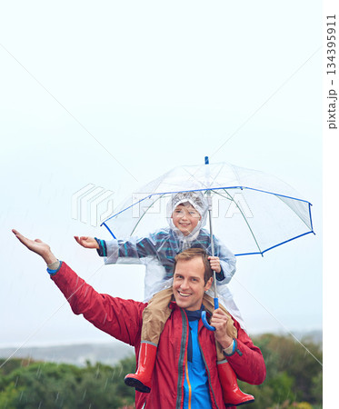Rain, umbrella and father with child for family portrait outdoor for fun, happiness and quality time. Man and boy kid in nature with hand to catch water drops for freedom, learning and play or mockup