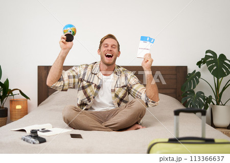 Portrait of cheerful, happy tourist, man sitting with plane tickets and a globe, packed suitcase for travelling around the world, going on vacation, excited about his holiday