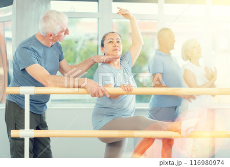 Active mature woman practicing leg stretching holding by ballet barre with instructor
