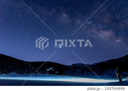 凍結した御池から見上げる天の川 快晴と積雪の冬の久住山 日本百名山 大分県、九重連山