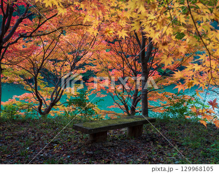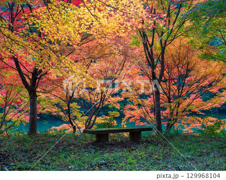 紅葉に囲まれた古いベンチ、三重県度会郡大台町