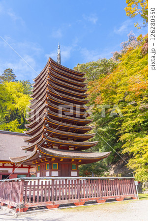 談山神社 紅葉に包まれた権殿・十三重塔・神廟拝所