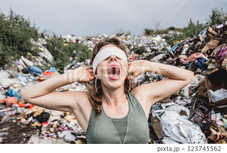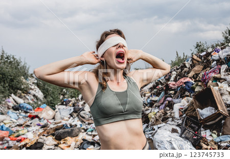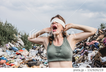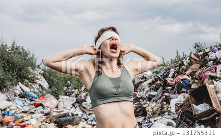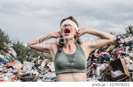 A blindfolded female volunteer screams from powerlessness in a dump of plastic