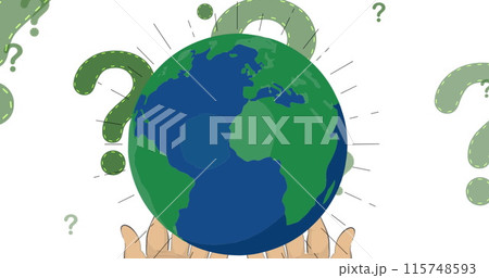Image of hands holding globe over question marks on white background
