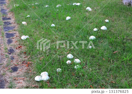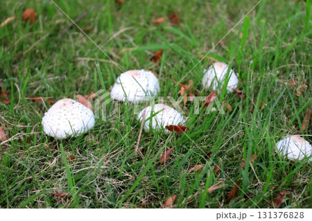 公園の芝生に生える白いキノコ(オオシロカラカサタケ)