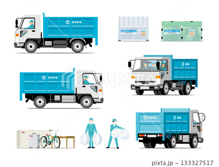 清掃局、ゴミ収集、大型ダンプ車とスタッフのセット