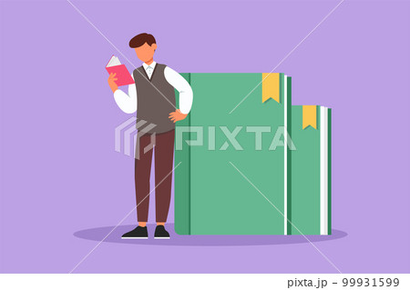 Cartoon flat style drawing young man reading and standing on big book. Intelligent male student learning and studying in library. Education and intellectual manner. Graphic design vector illustration