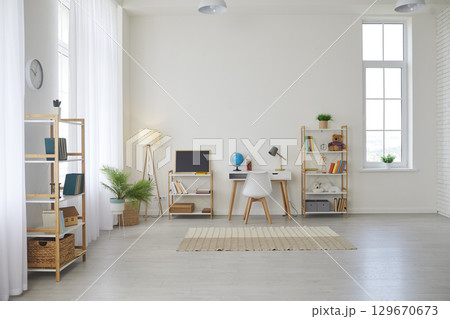 Modern children's room interior with study desk, shelves, board, lamps, plants and rug