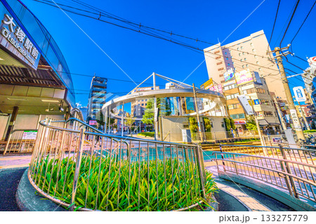 日本の東京都市景観 大塚駅(北口)や美しい太陽光。大塚駅北口駅前広場がリニューアル