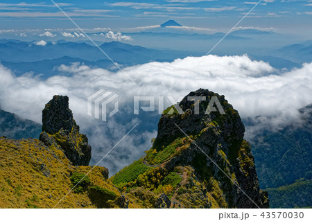 八ヶ岳連峰・赤岳の登りから見る大天狗・小天狗の岩峰と富士山