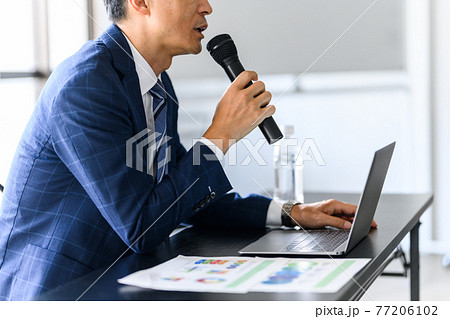 ビジネス マイクを持ってスピーチをするシニア男性