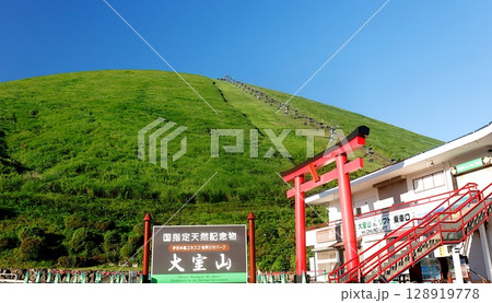 伊豆高原、山焼き後の黒い大室山:リフト乗り場と鳥居
