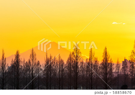 埼玉県 荒川河川敷のメタセコイア並木と富士山の夕景