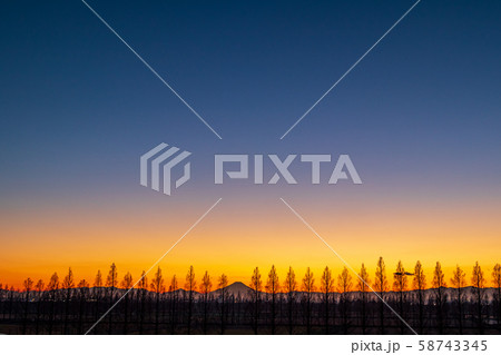 メタセコイア並木越しの夕暮れの富士山