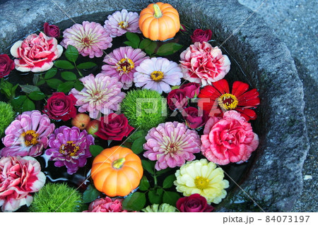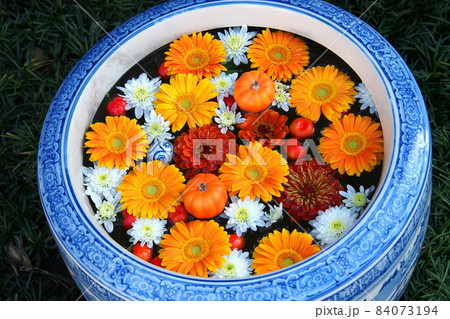 行田八幡神社周辺の花手水、オレンジと紫と黄色のガーベラ【埼玉県行田