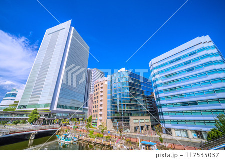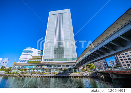 JR桜木町駅前 大岡川と横浜市庁舎のビルディング