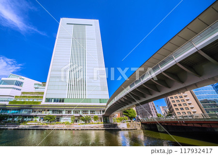 JR桜木町駅前 大岡川の歩道橋と横浜市庁舎のビルディング