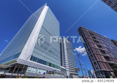 日本の横浜都市景観 桜木町駅 新南口前から横浜市役所や桜木町駅入口などを望む。車無し=8月17日
