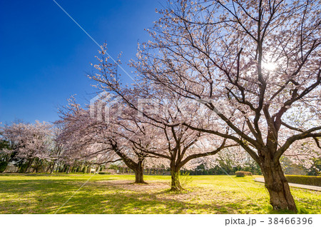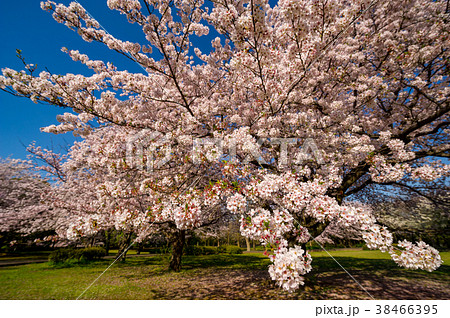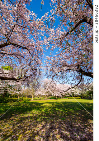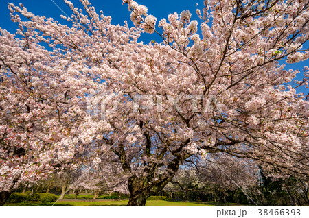 藤沢市 大庭城址公園の新緑桜の木と芝生広場