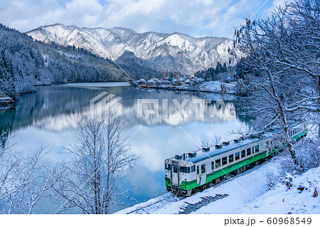 【只見線】 雪山のリフレクションと電車のある風景