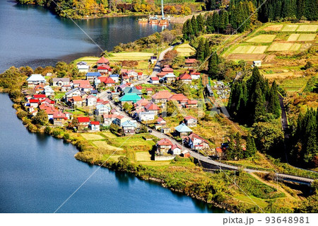 只見川と会津金山町の大志集落と只見線ローカル列車