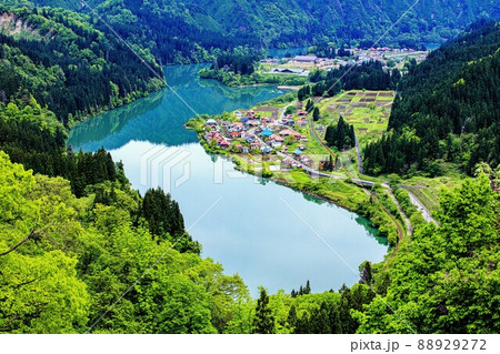 5月中旬、尻吹峠から俯瞰する新緑の大志集落【福島県金山町】