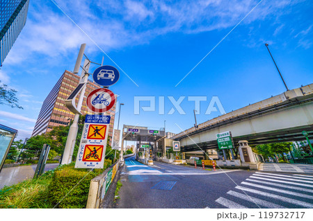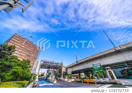 日本の東京都市景観 大手町のオフィス街や神田橋料金所などを望む