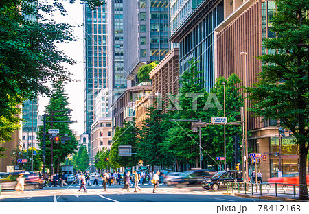 日本の東京都市景観 大手町駅前交差点から新緑のビジネス街などを望む