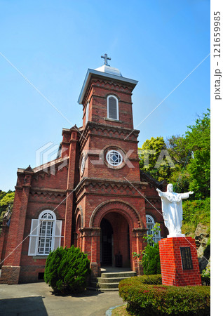 中通島大曽教会の赤レンガ造りの建物と二つの白い像の景色