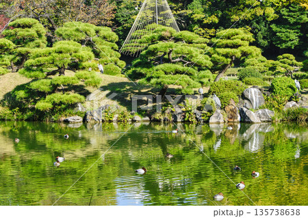 東京都 江東区 清澄庭園 大泉水 中の島 水鳥の風景 都指定名勝