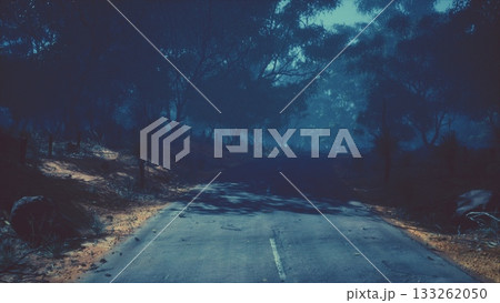 Winding through enchanted woods, a quiet road emerges beneath a twilight sky. Shadows dance among trees, creating an atmosphere of eerie serenity and peaceful solitude.