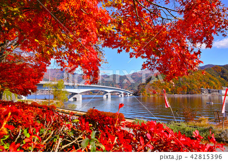 河口湖大池公園から見た紅葉シーズンの河口湖大橋