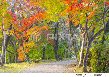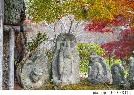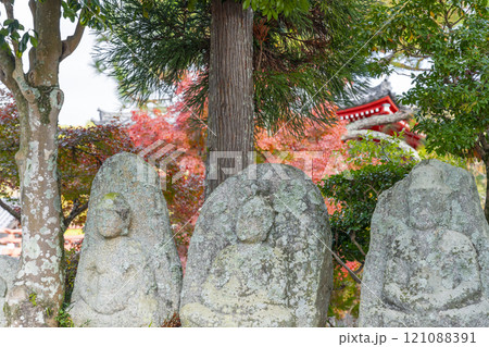 秋の京都 大覚寺 紅葉に包まれた大沢池エリアの石仏群