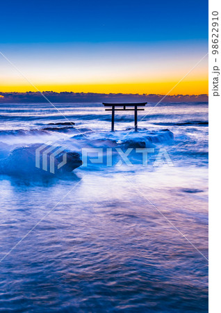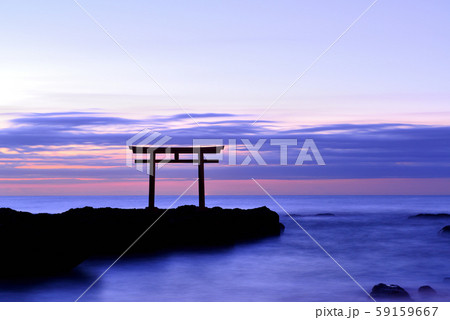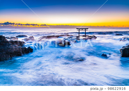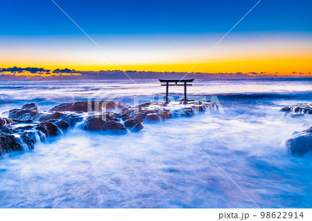 「茨城県」日の出前、海岸に佇む鳥居 大洗磯前神社