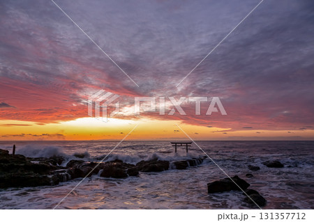炎のように波と岩場が燃える荒波の神磯日の出風景