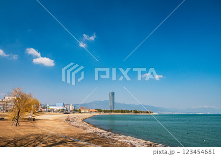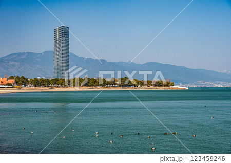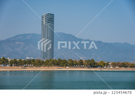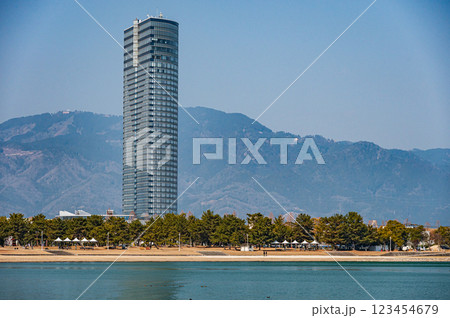 琵琶湖大津湖岸なぎさ公園からの高層ホテルと比叡山の眺め