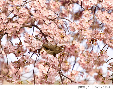 満開の桜の蜜を吸うメジロ