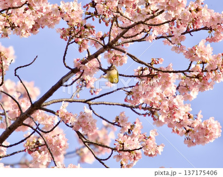 青空に映える満開の桜とメジロ