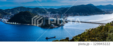 火の山公園から見る関門海峡の船島(巌流島)、彦島、北九州市小倉付近