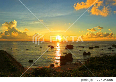 沖縄 黄金色に輝く朝日 宮古島 東平安名崎