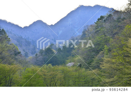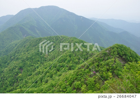 丹沢の大室山 犬越路南コース 用木沢の新緑と小笄と大笄を望む