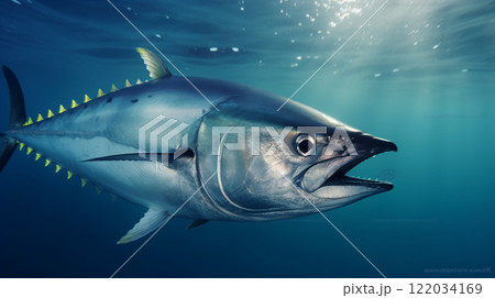 Close up of tuna fish swimming under the surface of blue ocean, light come from the surface.