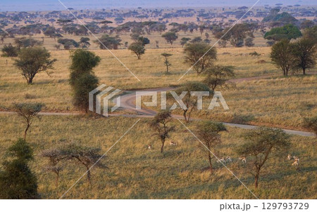 曲がりくねる道と朝のインパラたち — セレンゲティの目覚め