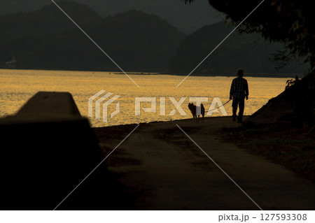 夕暮れ時の海沿いを愛犬と散歩