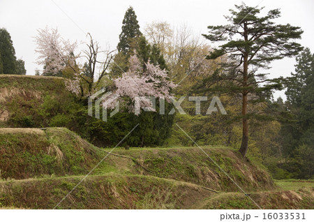 山桜き小雨降る田植え前の松之山大砺の棚田