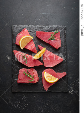 Raw tuna fish steaks fillet rosemary lemon black slate background healthy