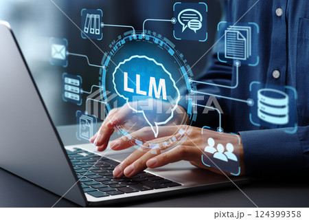 大規模言語モデルLLMとカスタムAIソリューション。AI駆動のオートメーション技術。ノートパソコンを