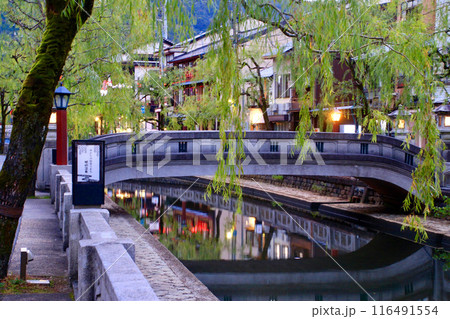 早朝の城崎温泉の町並み 風情ある枝垂れ柳